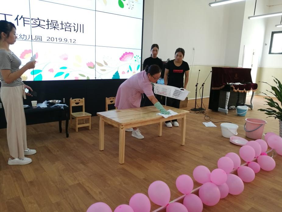 新园伊始,发奋前行:江口县第三幼儿园是一所在国家精准扶贫政策下新建的幼儿园,因有政府的大力支持,园舍、设施设备都是崭新和先进的。但是这里的老师基本是没有任何工作经验的新教师,如何在短时间内使用好崭新的校园物资,让幼儿园顺利运作,成了当前的难题。开学工作,保育先行。为了争取时间,芳芳老师及时准备了保教讲座,图文结合的方式为保育员进行了培训,让她们更进一步了解幼儿园卫生保健制度和要求,同时她向大家演示了保育员消毒桌面的全部流程,并邀请三幼行政一起演示三位一体照顾幼儿的方法,为三幼的保育员们带来了生动形象的一课,为开学打下了坚实的基础。