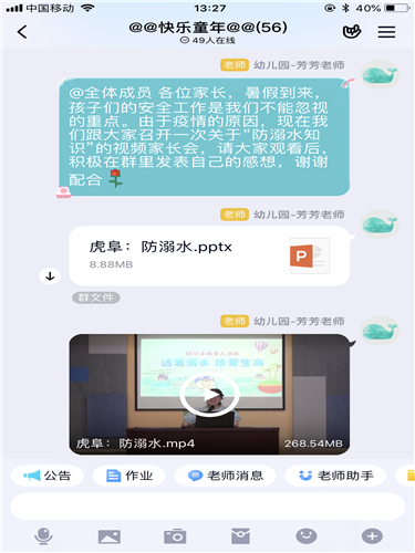 防溺水专题家长会:疫情之下,不少家庭的孩子在家休息。为确保虎阜实幼的每一位幼儿了解防溺水知识,虎阜的老师们特制了视频家长会和PPT课件,通过班级QQ群、微信群等各种渠道向家长宣传安全知识,帮助家长增强安全意识和监护意识,切实承担起监护责任,加强对幼儿的教育和管理,特别是外出游玩时的管理,给幼儿传授相关知识和技能,不断加强幼儿的安全意识和自我保护意识。