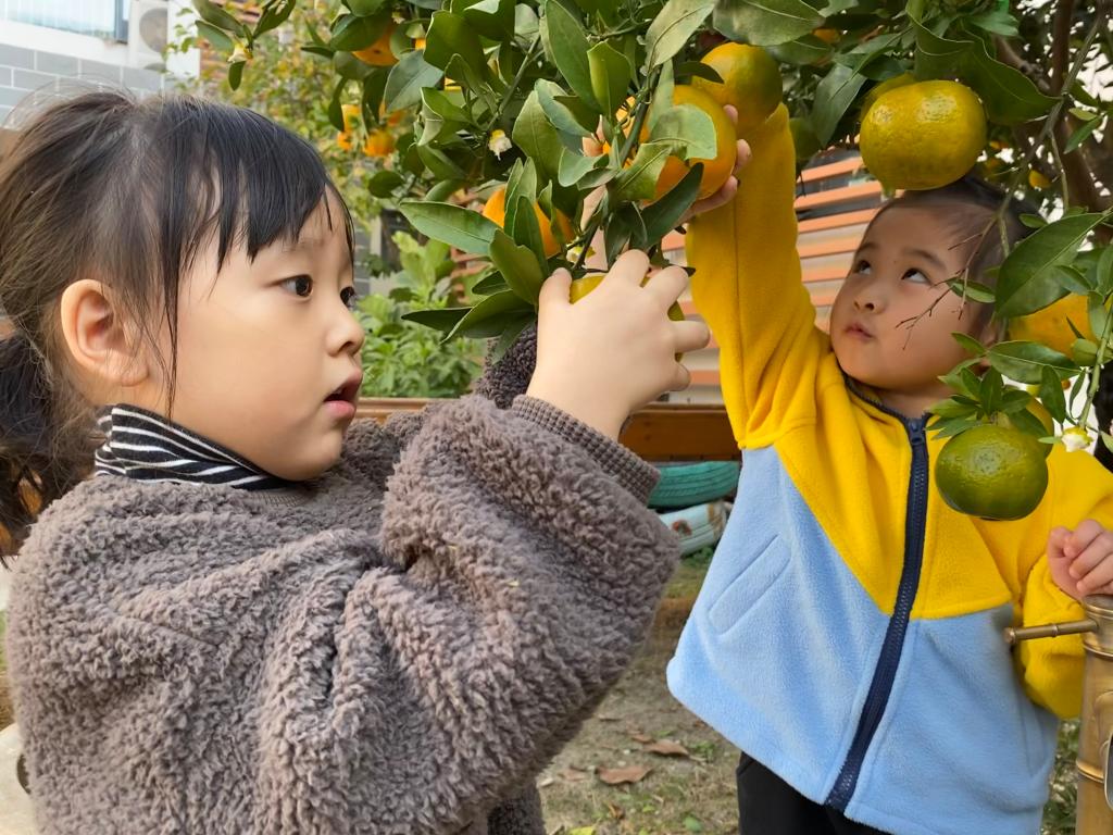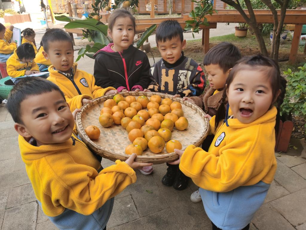 幼儿园沙池边上的橘子树,渐渐地长出了小小的果实,从温暖的春季,经过炎热的夏季,终于在秋高气爽的秋天迎来了丰收!秋天的黄色是橘子成熟的黄色,一个个橘子挂在枝头,像小灯笼似的,惹人喜爱,仿佛在向小朋友招手:“快来摘我吧!”虎阜娃们踮起脚尖,伸长胳膊,轻轻一拧,一个个又大又甜的橘子落到了掌心中,孩子们轻捧着橘子,和好朋友一起讲述和分享着丰收的喜悦!中大班的哥哥姐姐将自己采摘的橘子和小班的弟弟妹妹进行了分享,剥开橘子皮,瓣瓣橘瓤挤在一起,孩子们你喂我一瓣,我喂你一瓣,互相分享着甜甜的橘子,感受着秋天的气息,体验了丰收的快乐。经历了亲手采摘、品尝、和分享橘子,孩子们迫切地想要将这些经历用自己的画笔记录下来,将这份新奇、愉快的体验留存!瞧~虎阜娃们巧妙构思,将橘子皮施上一道魔法,变成了一朵朵小花,跃然纸上,再添画上一些形态各异的橘子树,制作成了一幅美丽的“乐在丰收”长画卷。