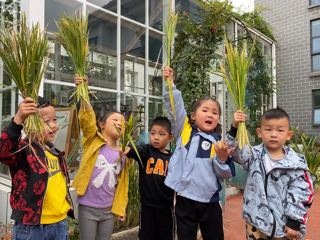 幼儿园的种植园里也是一片丰收景象,茄子、扁婆、空心菜、胡萝卜……大大的香梨,孩子们有的观察讲述着蔬果们的外形,有的将成熟的蔬果进行进行采摘,还有的带上了自己的画笔和画板,将这秋收的景色绘画记录了下来......种植园金黄色的水稻也由翠翠的绿色逐渐变黄颗粒饱满,午餐后,几位“小农民”拿着镰刀,在生活老师的指导下,小心收割着。