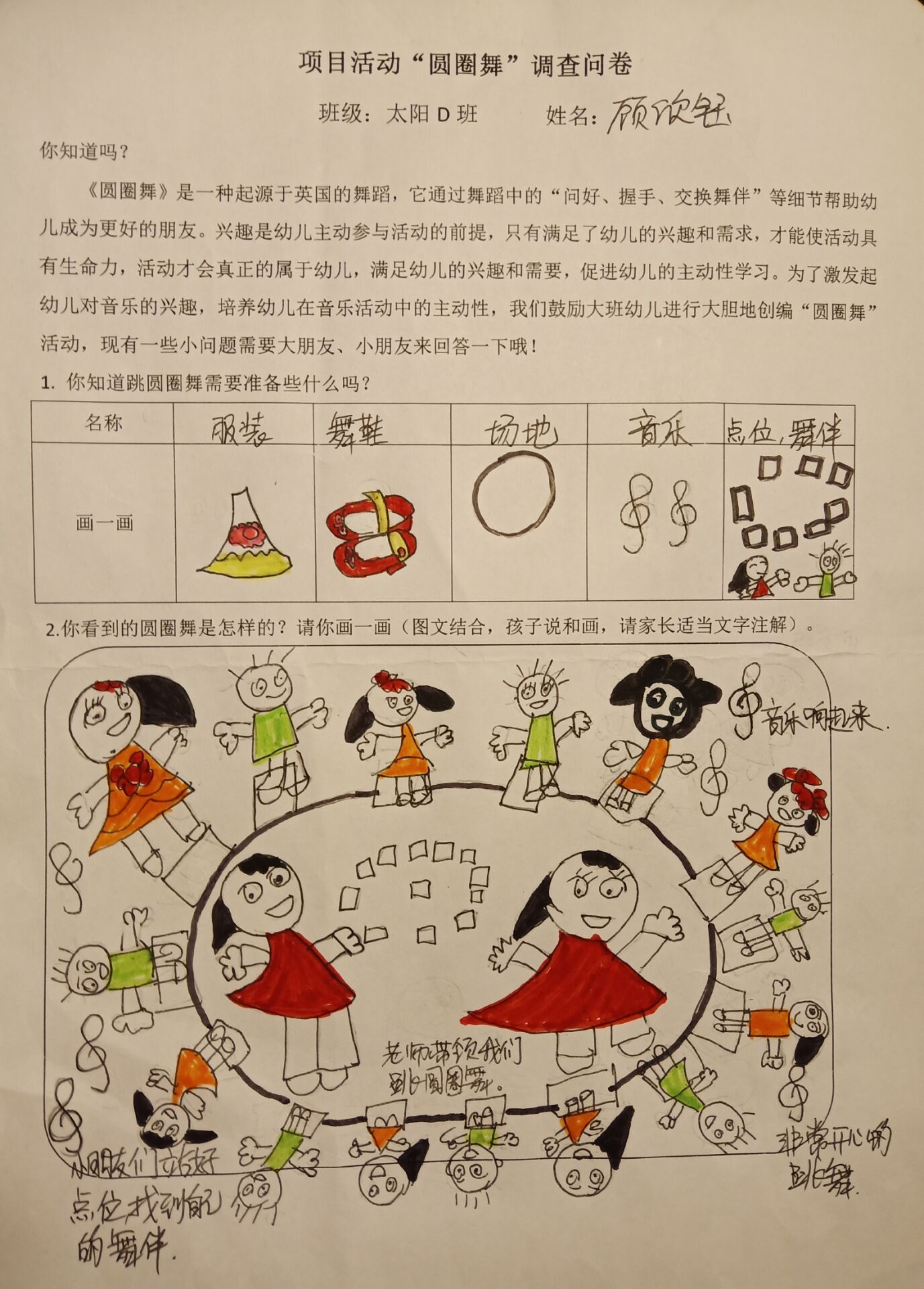 亲子探索圆圈舞拉开了活动的序幕,通过填写调查问卷,家长和孩子们共同查阅资料,欣赏了不同形式的圆圈舞视频,为接下来的活动做好了积极的准备;随后在设计圆圈舞的活动中,孩子们就圆圈舞的队形、动作进行了激烈的讨论,热情高涨。在讨论之后, 孩子们就独自或者合作着手设计圆圈舞的图纸,看!这是孩子们的设计图纸~有一个圆圈、两个圆圈,甚至三个圆圈的队形。并且,每一组设计的动作也是不一样,有拉手的、有举手的,有蹲的、有站的。宝贝们的想象力真是无限精彩~在编排舞蹈的过程中,孩子们也遇到了困难,如:舞伴间配合不默契,动作不合拍,队形不整齐。每当遇到问题时,小朋友都会全力合作,将困难打倒~随着不断地改进与调整,孩子们创编的圆圈舞出炉啦!在每天的午后,孩子们都会穿上马甲,来跳一跳圆圈舞,伴随着音乐响起,孩子们踩着节拍、与搭档开始自己的表演。一张张稚嫩的小脸都充满了自信,大家都想成为更好的自己!