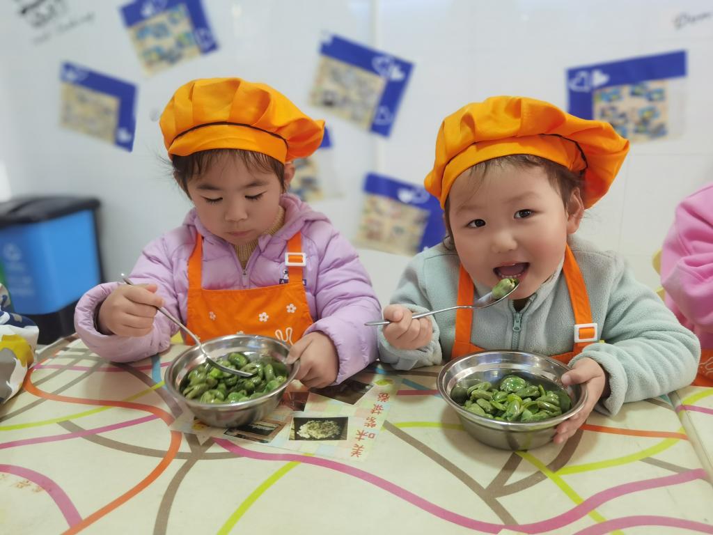 尝时令,品春味:小班年级组根据幼儿的兴趣,以幼儿的视野走进大自然,一起发现大自然中新奇、有趣的事物,强烈的好奇心和探究欲帮助孩子们识别了种植园里蔬菜的名称与外形,萌娃们采蔬菜、择蔬菜和品蔬菜,在老师们的帮助下,大家一起品尝了蚕豆和鸡毛菜,随后,孩子们在家中还和爸爸妈妈们一起烹饪了春季的其他时令菜,如:螺蛳、春笋,香椿头等,在体验和品味中收获满满~