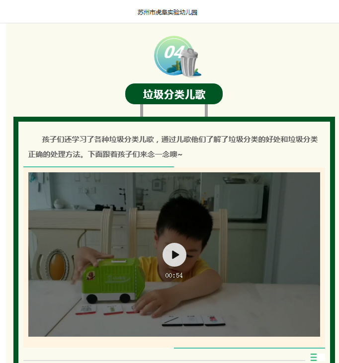 通过这一系列教育活动,在孩子幼小的心灵播下了爱护环境的种子,达到“以教育一个幼儿,带动一个家庭,以一个家庭带动一个群体”的教育目的,将垃圾分类真正地落实到生活的每一处角落,植根在每个人心里,从生活中的点滴都有垃圾分类的身影。