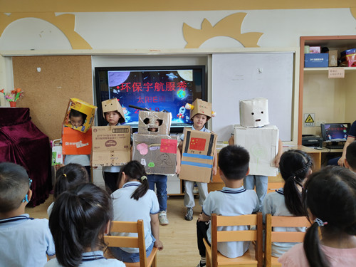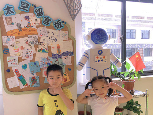 小朋友们在老师的带领下,通过观看视频,认识了三位航天英雄,激发了探索宇宙的热情。小朋友们观看视频后,欣喜地利用彩笔描绘出他们心中伟大的航天梦。有的幼儿将自己想说的话,记录在太空留言板上;有的幼儿用积木搭建出了心中的宇航空间站,还有的孩子在家长的协助下利用废旧物品设计了环保宇航服。家长还利用周末带孩子们参观科技馆,让孩子们了解关于航天航空的知识,实地体验航空文化。昨日下午起床后,全园的孩子们回看了航天员英雄们回归的视频,兴奋地欢呼着!
