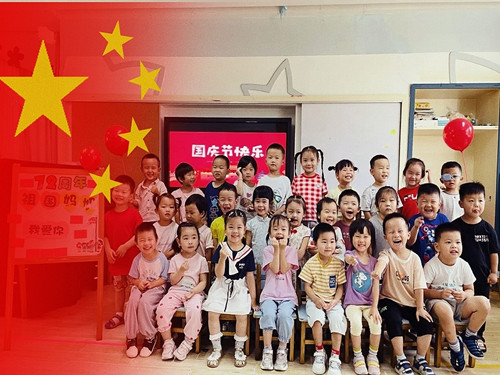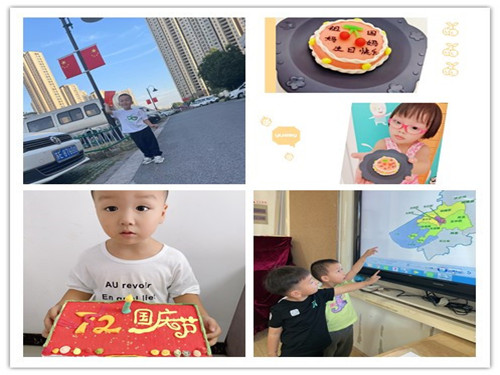 全园的孩子们用各种不同的方式来庆祝这个节日:有的孩子通过绘画、拼贴制作了爱心贺卡,用灵巧的双手向祖国妈妈献礼;有的孩子走出家门,寻找五星红旗,展露自已灿烂的微笑与国旗合影留念;有的孩子穿上了漂亮的汉服,吟诵着《三字经》、《春晓》、《咏鹅》等古诗词,让大家感知中国古诗词的唯美,感受中华经典文化的魅力;有的孩子和爸爸妈妈一起用废旧材料制作了可爱精致的生日蛋糕,表达了自己对祖国母亲的热爱和真诚的祝福;还有的孩子在中国地图上寻找着自己家乡的位置,激发了他们爱祖国、爱家乡的情感。