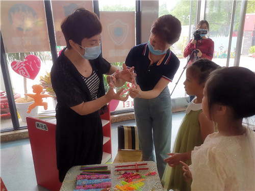 活动中,虎阜实幼的师生们共同搜集了30年代起至今的玩具,根据年代的不同以集市的形式分别展示了5个玩具摊位,每个摊位还有一名属于那个年代的教师代表陪伴孩子们一起游戏:30-40年代是太爷爷、太奶奶的年代。那时候尽管玩具不多,如:滚铁环的游戏,手绢小老鼠等,但其玩法却多样百变,现场连线还请来了90岁的太婆婆教孩子们做手绢老鼠,体验了那年代自制玩具的乐趣;50-60年代是爷爷奶奶的年代,孩子们玩着用鸡毛做的毽子,用木头做的红缨枪,三五成群地跳起了皮筋…感叹着爷爷奶奶的巧手变出了好玩的玩具;70-80年代是爸爸妈妈们的年代,发条小青蛙的蹦跶,翻花绳的百变,吸引着孩子们乐此不疲地探索游戏;90-00年代是哥哥姐姐的年代,五彩的泡泡胶正绽放在孩子们的唇边,溜溜球随着灵活的绳线自由旋转,孩子们展开了纯真的笑颜;10后年代是孩子们的时代,人工智能技术广泛运用,如乐高玩具、电动玩具、仿真发声玩具等,给孩子们带来了前所未有的玩具体验,更多的快乐。